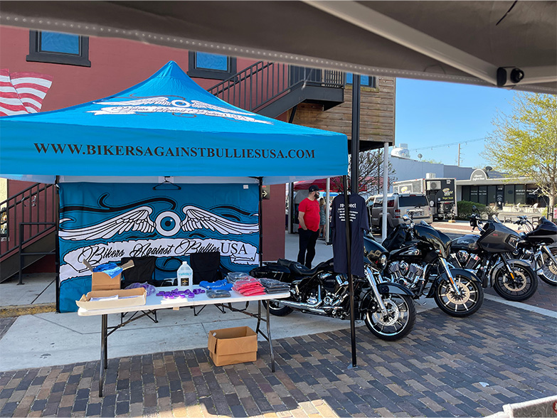 Thank you to Bikers Against Bullies USA for sending us these amazing photos of their tent setup! Their tent looked great being set up against the brick building and beside those beautiful bikes. This tent package that we created for them is a 10x10 Impact Package. This particular package includes a custom 10x10 printed Canopy, a 10ft Full Height custom printed Back Wall, and a choice of Pro Expo or Trader Series Frame! The design of this pop-up tent turned out great! The black lettering and imagery on the back wall matches our anodized frame perfectly! Matching the color of your design to one of our frames is a really awesome way to make your display look uniform and colorful!