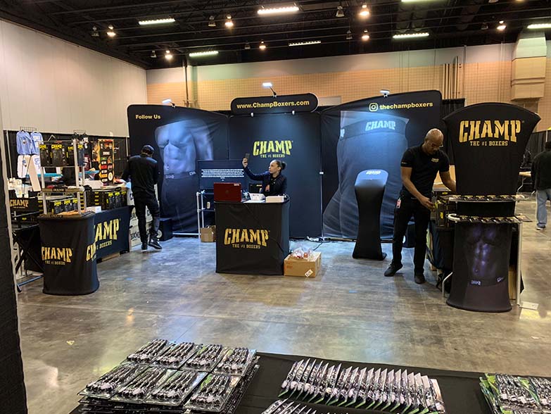 Champ Boxers (Champboxers.com) chose our 20ft Trade Show Booth K for their Event. This custom logo popup booth offers TV and ipad display areas, units with shelving, and a custom printed Podium that is also a travel case for the booth. For additional display space, they also added a few Stretch Table Covers!