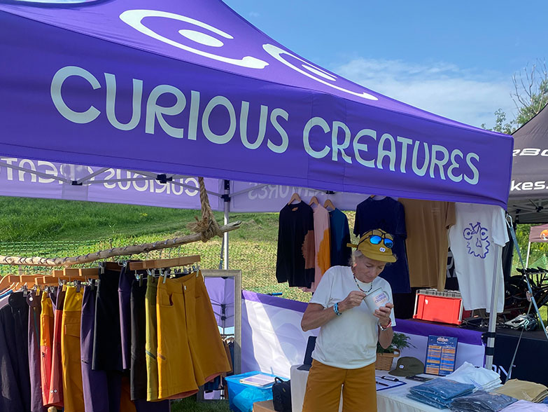 Curious Creatures ultimately selected the 10ft x 10ft Vision Digital Package, a popular choice amongst the MTB community. This comprehensive package includes a full-color sublimation printed canopy and three 10ft half-height walls with striking single-sided sublimation printing. The wall branding is noticeable from a distance yet visibility into the tent remains clear, ensuring merchandise can be seen from all angles.
