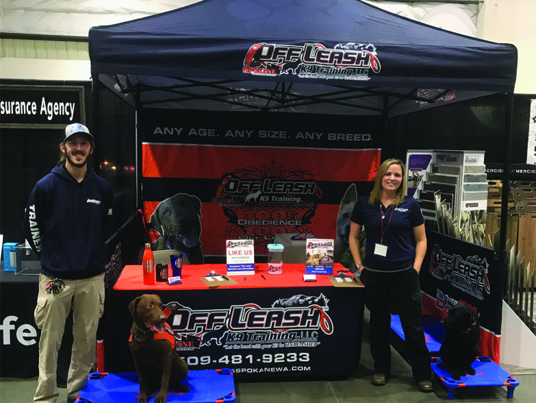 Off Leash K9 Training Spokane ordered a fabulous instant tent. Their 10x10 Trader Digital Package has a canopy, full back wall, 2 x half walls and a 6ft fitted table cover. But this tent has so much more! They chose the vented canopy option, wraparound upgrades for the half walls, and double-printing on their back wall making it a fully personalized tent!