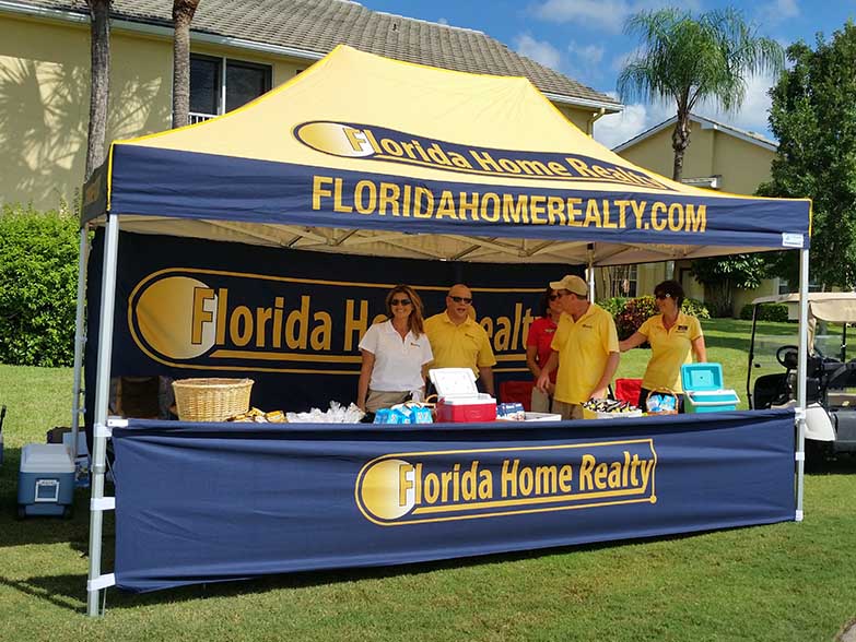 Here's another awesome 10ft x 15ft Custom Tent we made for Florida Home Realty! The package included a dye sub canopy with print on all four peaks and valances, a 15ft wide back wall with full color print, and a half height front wall complete with aluminum support bar and brackets. Thanks to Florida Home Realty for such a great photo!