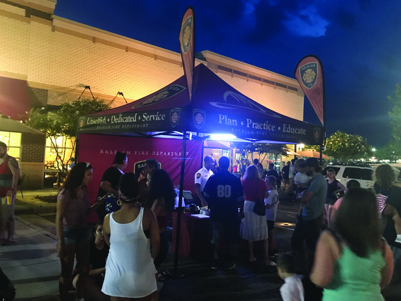 At a Festival in Downtown Raleigh last weekend the Raleigh Fire Department unveiled this 13ft x 13ft Trader Digital Plus Package with LED lights and our unique Pivoting Walls, for the very first time. If there are two things the Raleigh Fire Department understands it is Grabbing Attention and Crowd Control. After working extensively with the RFD across several face to face meetings, our Design Team came up with this awesome layout that looks amazing Day or Night. The Super Bright LED lights attract people to the Custom Printed Canopy, and the Pivoting Walls help keep the crowd flowing with ease.