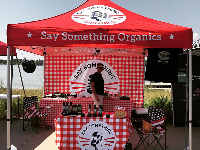 Say Something Organics opted for our 10ft x 10ft Impact Pro package which includes a full color custom printed canopy (sublimation printing), a 10ft full height back wall with single sided print (double sided upgrades are available), and a 6ft Custom Table Cover. They opted for our Trader Series aluminum frame which is a high quality medium duty frame weighing in at 42lbs - easy to transport yet durable enough to last many years!